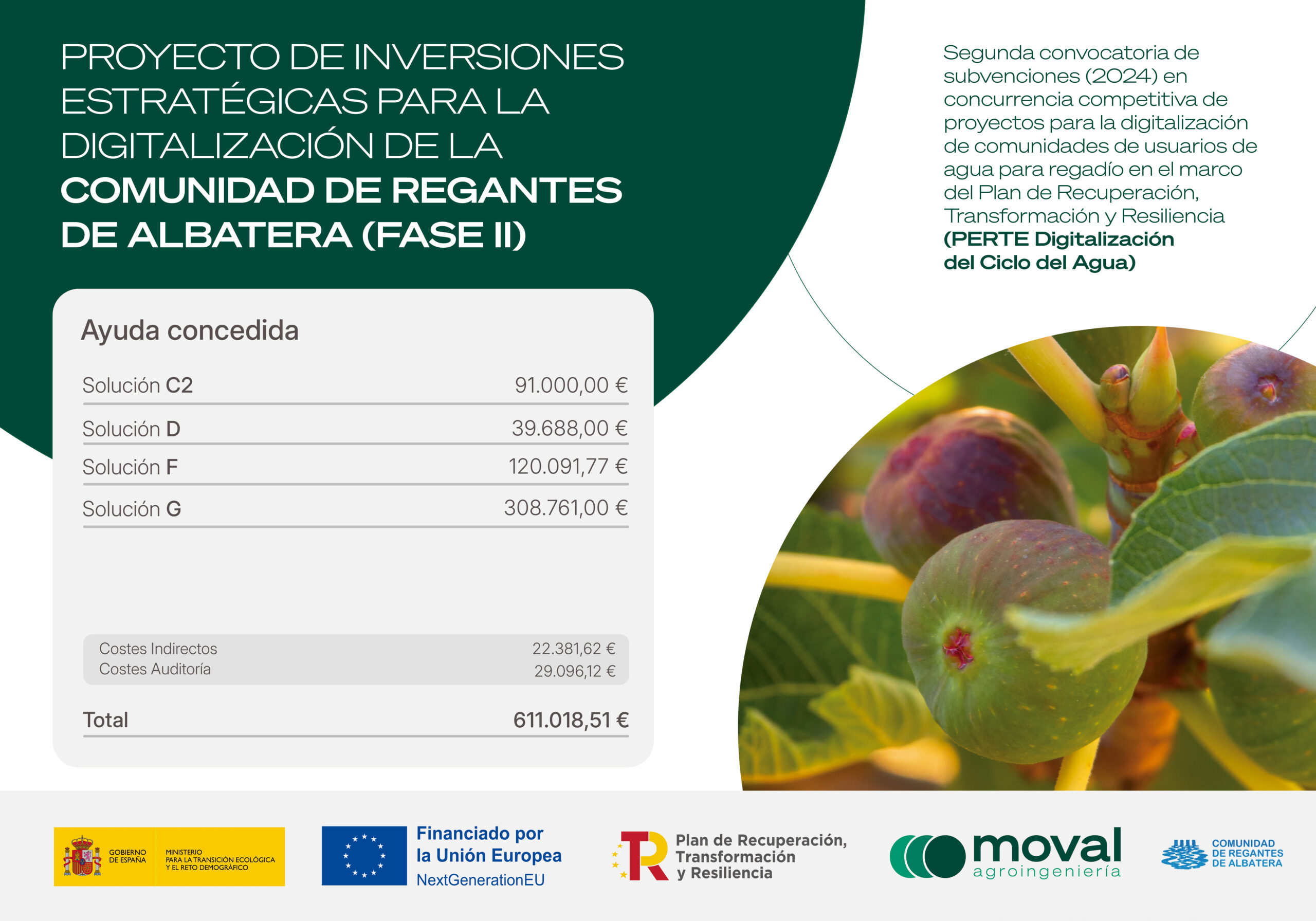 Para hacer realidad esta transformación digital, la Comunidad de Regantes de Albatera contará con una ayuda total de 611.018,51 € en el marco del Plan de Recuperación, Transformación y Resiliencia –financiado por la Unión Europea– NextGenerationEU, gestionadas por el Ministerio para la Transición Ecológica y el Reto Demográfico, que se reparten entre las distintas soluciones indicadas.