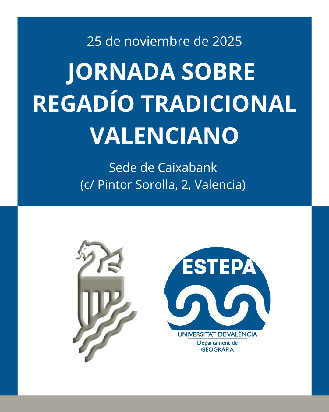 La Federación de Comunidades de Regantes de la Comunidad Valenciana (FECOREVA) y la unidad de investigación ESTEPA del departamento de geografía de la Universitat de València (UV) organizan la “Jornada sobre regadío tradicional valenciano” el próximo día 25 de noviembre de 2025 en la sede de Caixabank en Valencia (c/ Pintor Sorolla, 2).