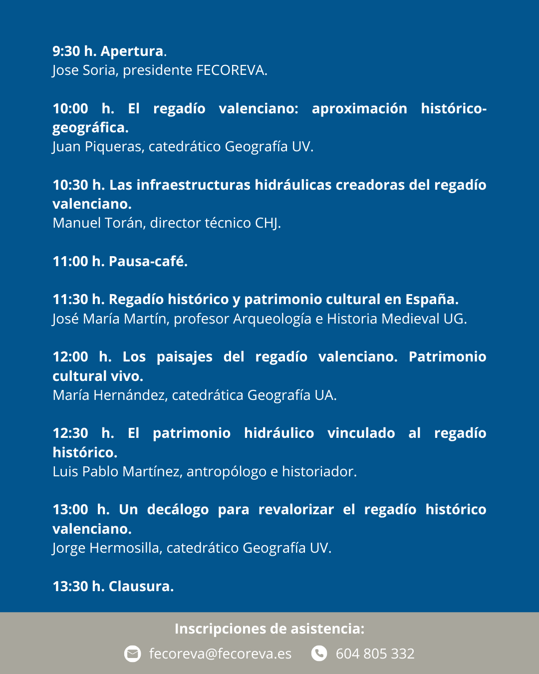 A mitad de la jornada habrá una pausa-café y, al final, una comida de hermandad en el Casino de Agricultura (c/ Comedias, 12). Para asistir a la jornada, es necesario inscribirse lo antes posible mandando un mensaje de confirmación de asistencia (en el que se indique el nombre y la entidad a la que se pertenece) al correo electrónico fecoreva@regantescv.com o llamando al teléfono 604 805 332.