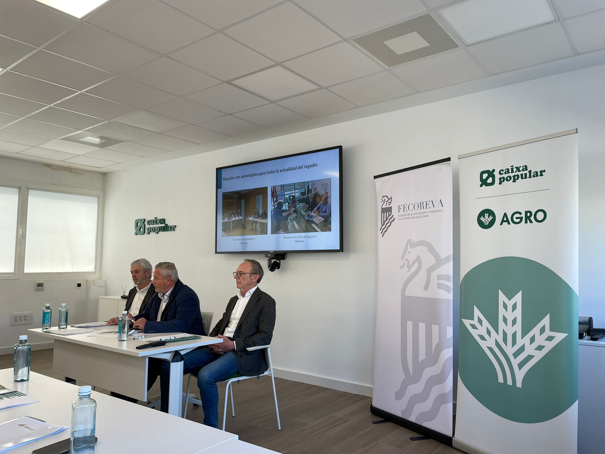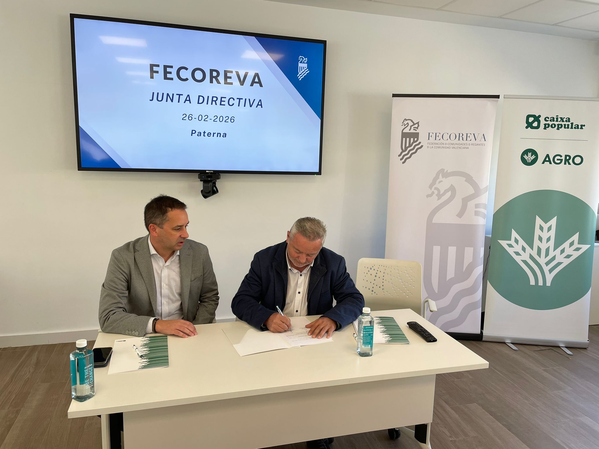 Después, tuvo lugar la firma de la renovación del convenio anual de colaboración entre FECOREVA y Caixa Popular, reforzando una alianza estratégica orientada a apoyar al sector del regadío y a las comunidades de regantes.